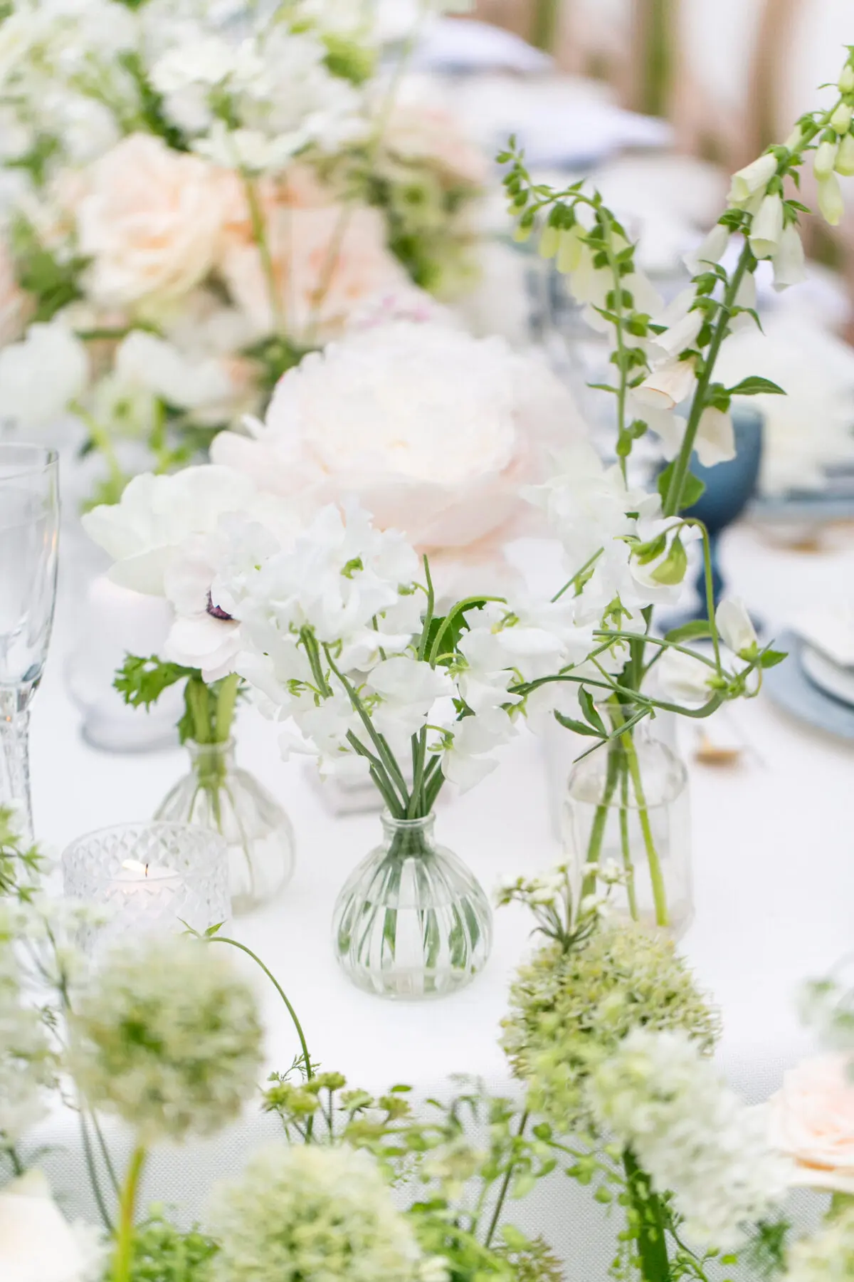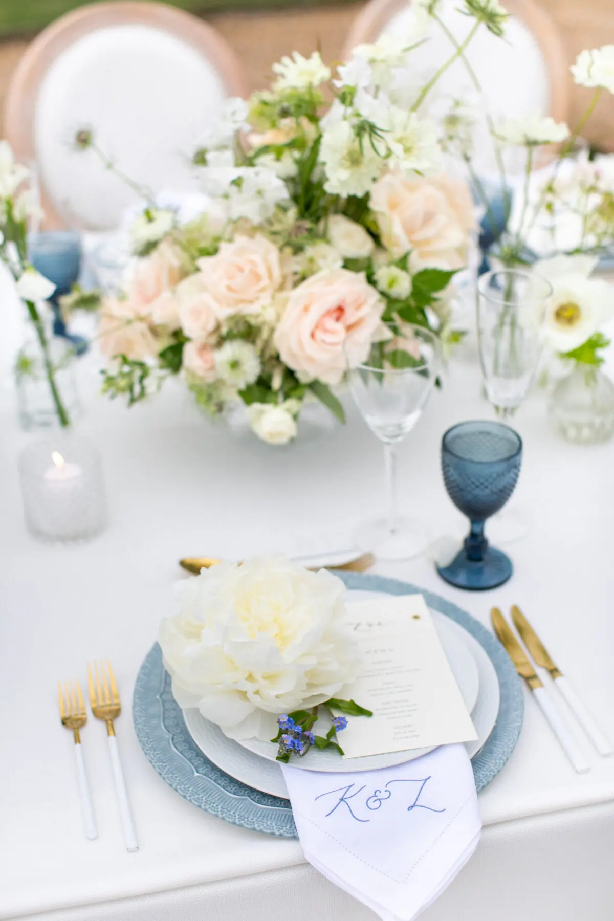 Being in such a beautiful country house venue, I wanted the wedding theme to follow suit. We kept the flowers very loose and whimsical in beautiful white and ivory colors with pops of “something blue” coming through in the glassware and crockery. Being the perfect season, we took advantage and used the gorgeous peonies for each place setting along with the forget-me-nots to symbolize the remembrance of good memories and true love. Detail is very important to me, especially when it came to showing the story of the wedding, from the welcome gifts in the rooms, through to the reserved signs at the ceremony and the gorgeous choice of flowers which most of were grown in the gorgeous English countryside, which made it all a little more special.