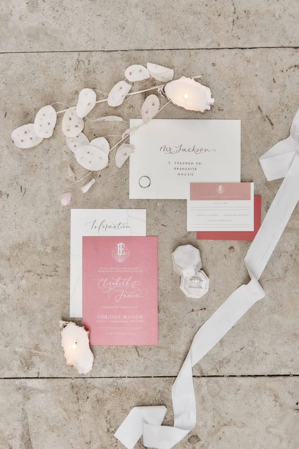When creating the design, we decided to use the details on the beautiful water feature in the Orangery at Euridge Manor to inspire the theme. This consists of hundreds of shells and pearls and you’ll see these little touches running throughout the shoot on the stationery, jewellery and smaller personal touches.