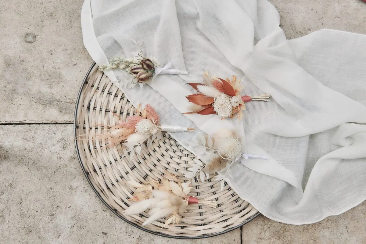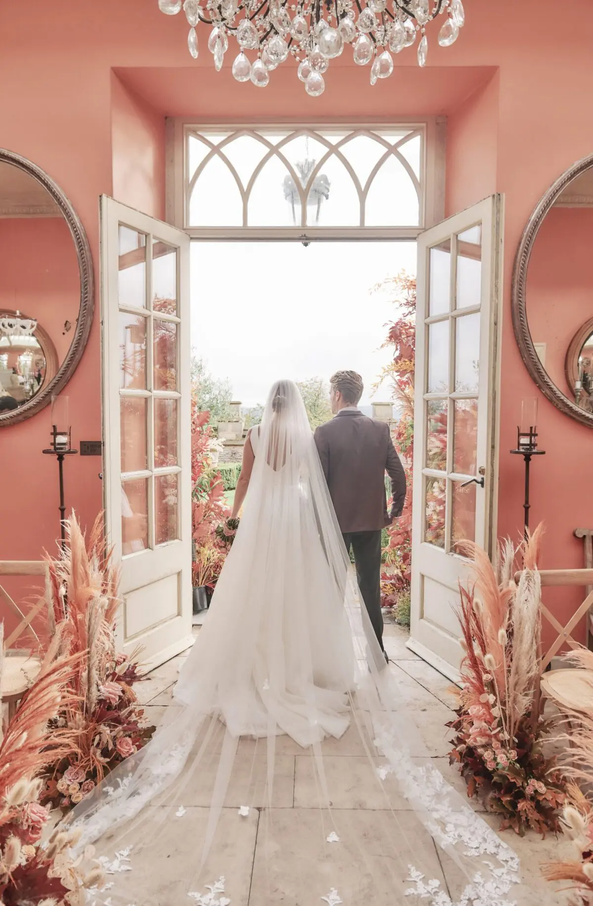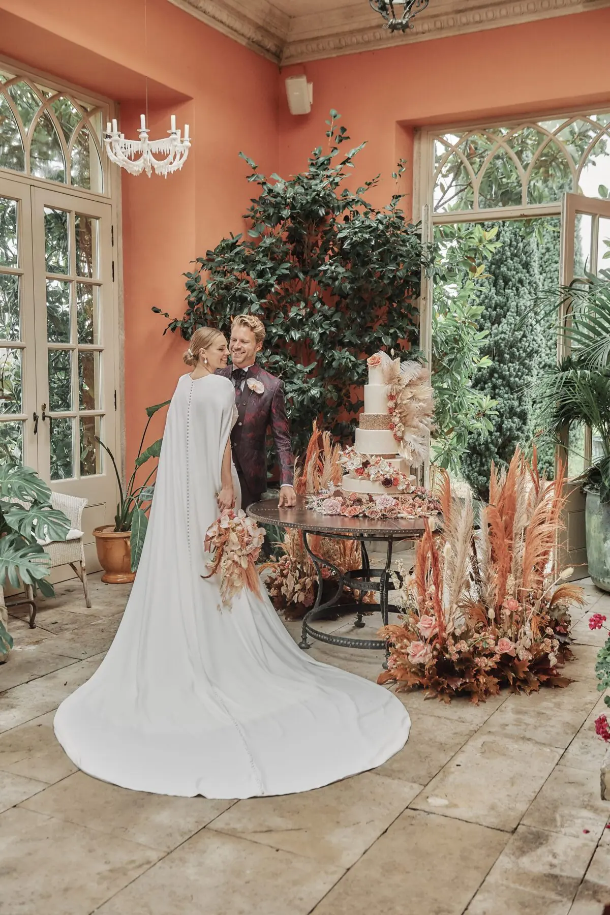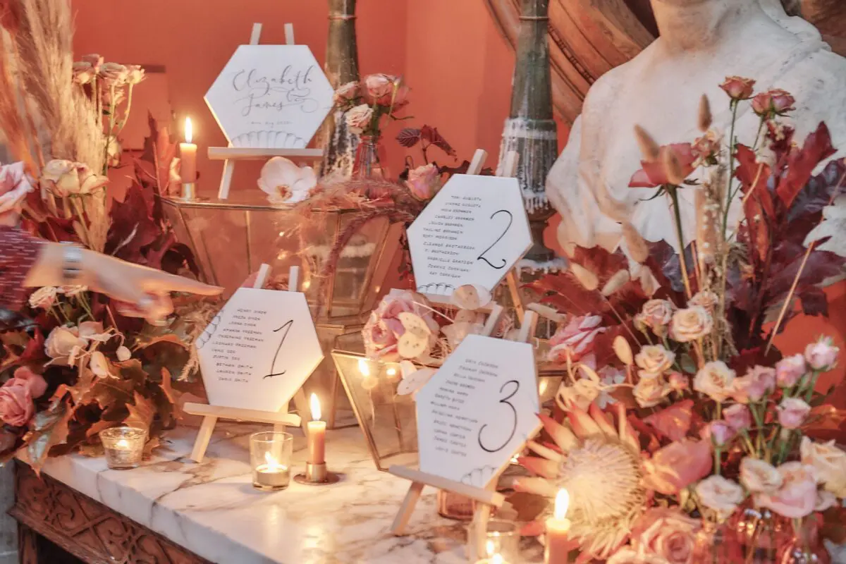 Décor details include jaw-dropping floral styling by Paula Rooney Floral Design. Paula and her team created all sorts of breathtaking displays using an abundance of foliage and florals in an earthy palette of orange, blush and dusky pinks in all sorts of textures, both dried and fresh.