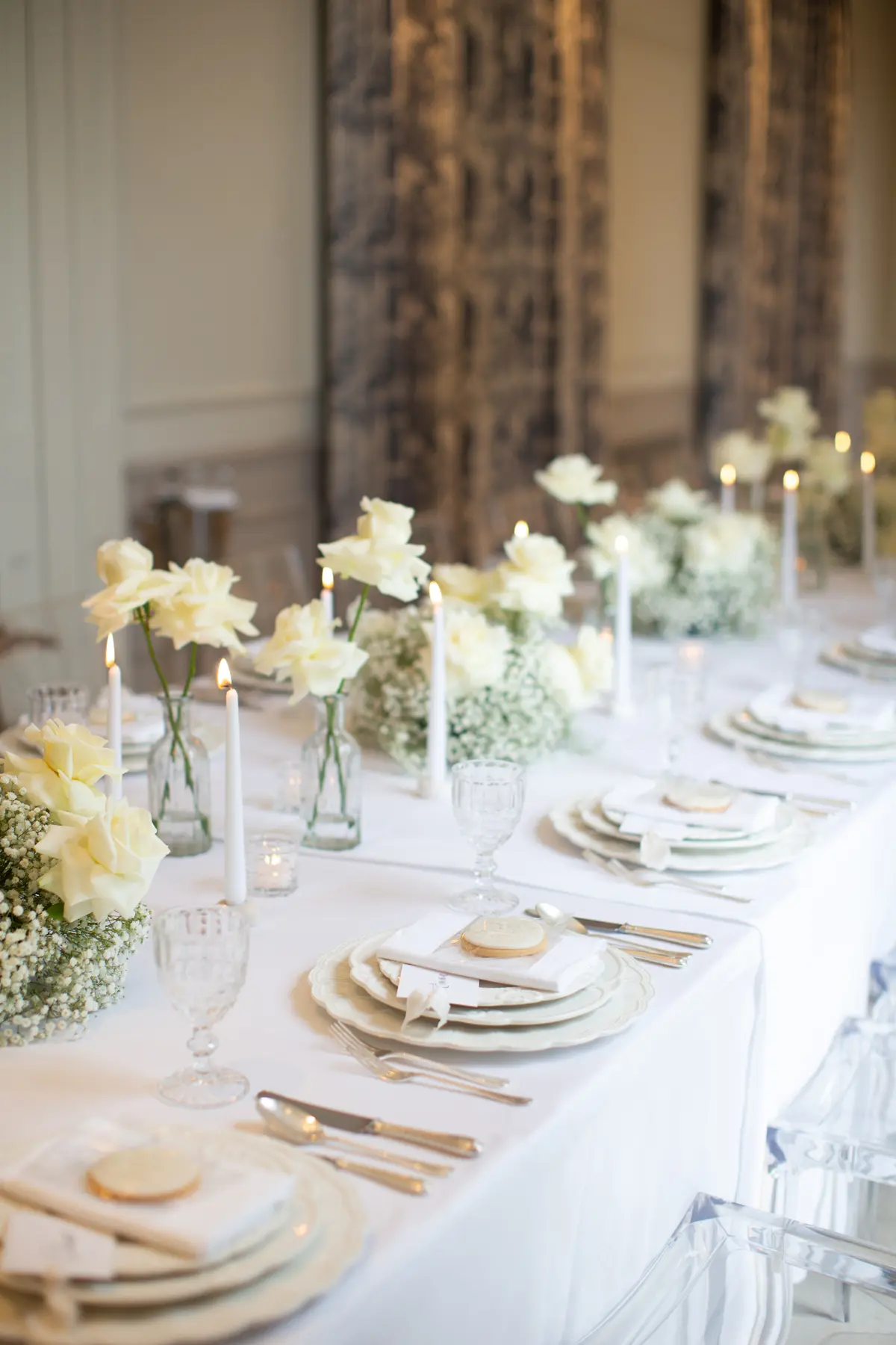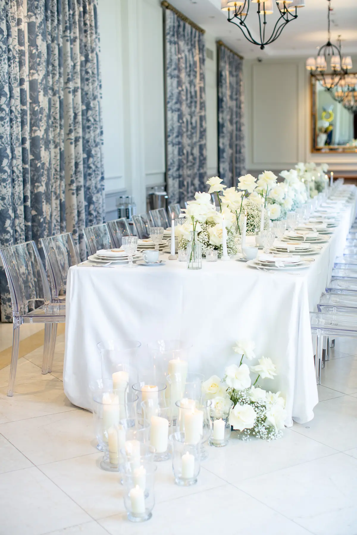 It’s one of my favourite venues in the country and the service is always second to none. I knew this would be a special place for my family and friends to attend. Guests arrived for a refreshment before taking part in a gypsophila crown making masterclass with the fabulous Paula Rooney before sitting down for a delicious afternoon tea. The design was kept clean and simple with beautiful white roses and fluffy gypsophila paired with stunning tableware and ghost chairs.