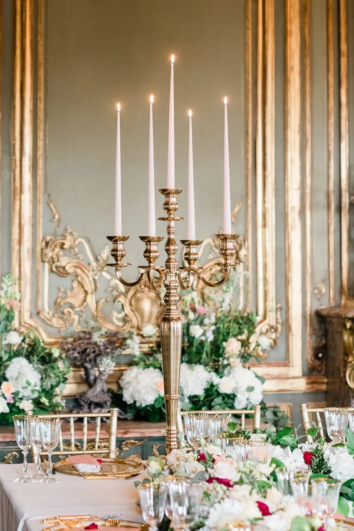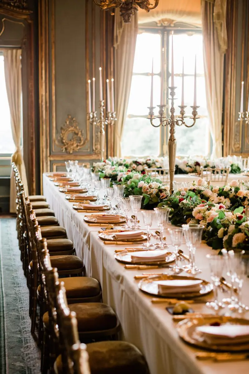After the blessings, guests enjoyed drinks and canapés on the sprawling lawn, serenaded by a beautiful string quartet. The atmosphere was filled with joy and celebration, an acknowledgment of the long-awaited union of Di and Chen. Dinner was held in the elegant French Dining Room, which was transformed into a candle-lit space, adorned with a sophisticated colour palette of white, red, and gold. The atmosphere was one of refinement and elegance, perfectly complementing the couple's love story.