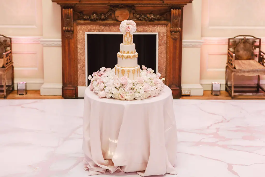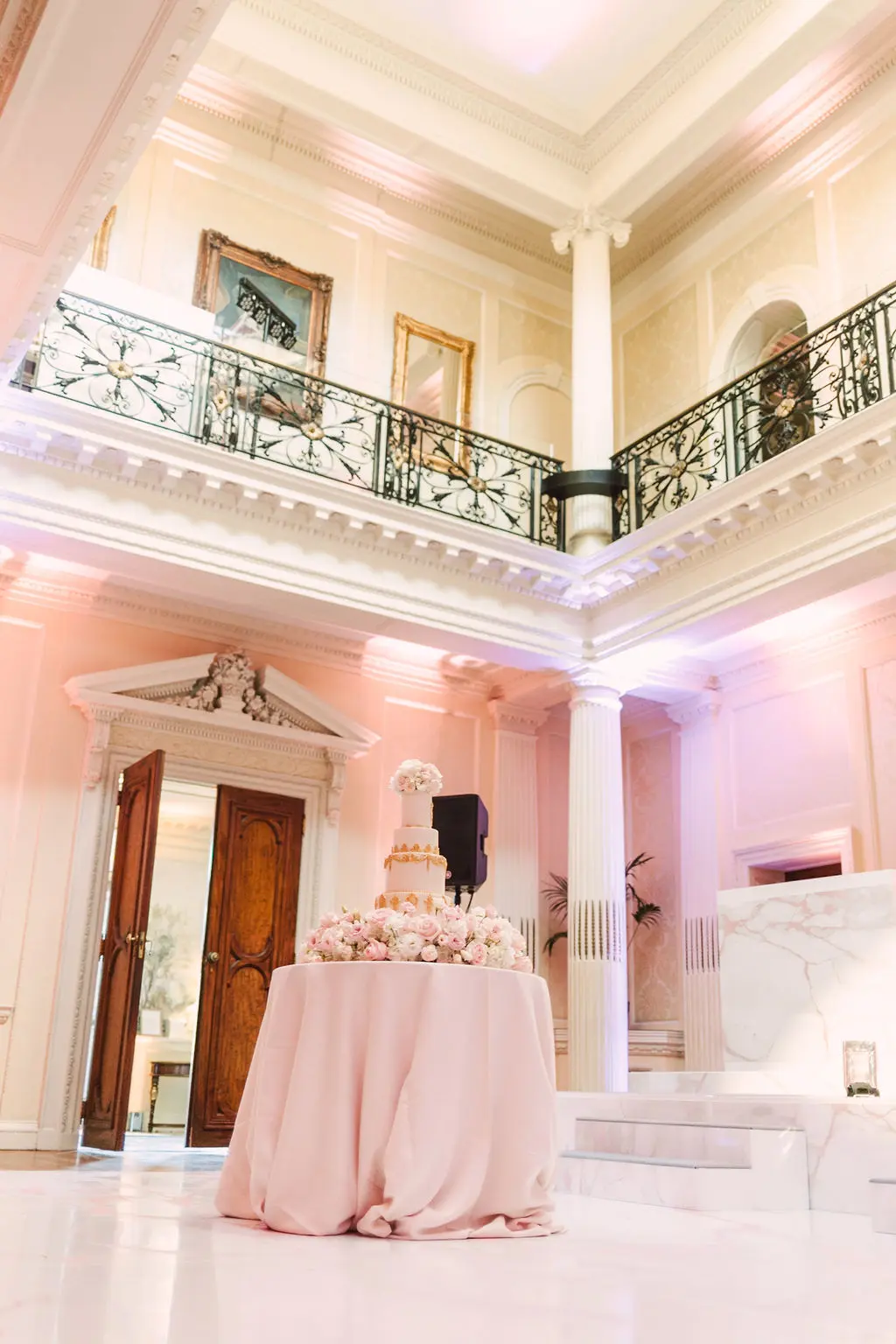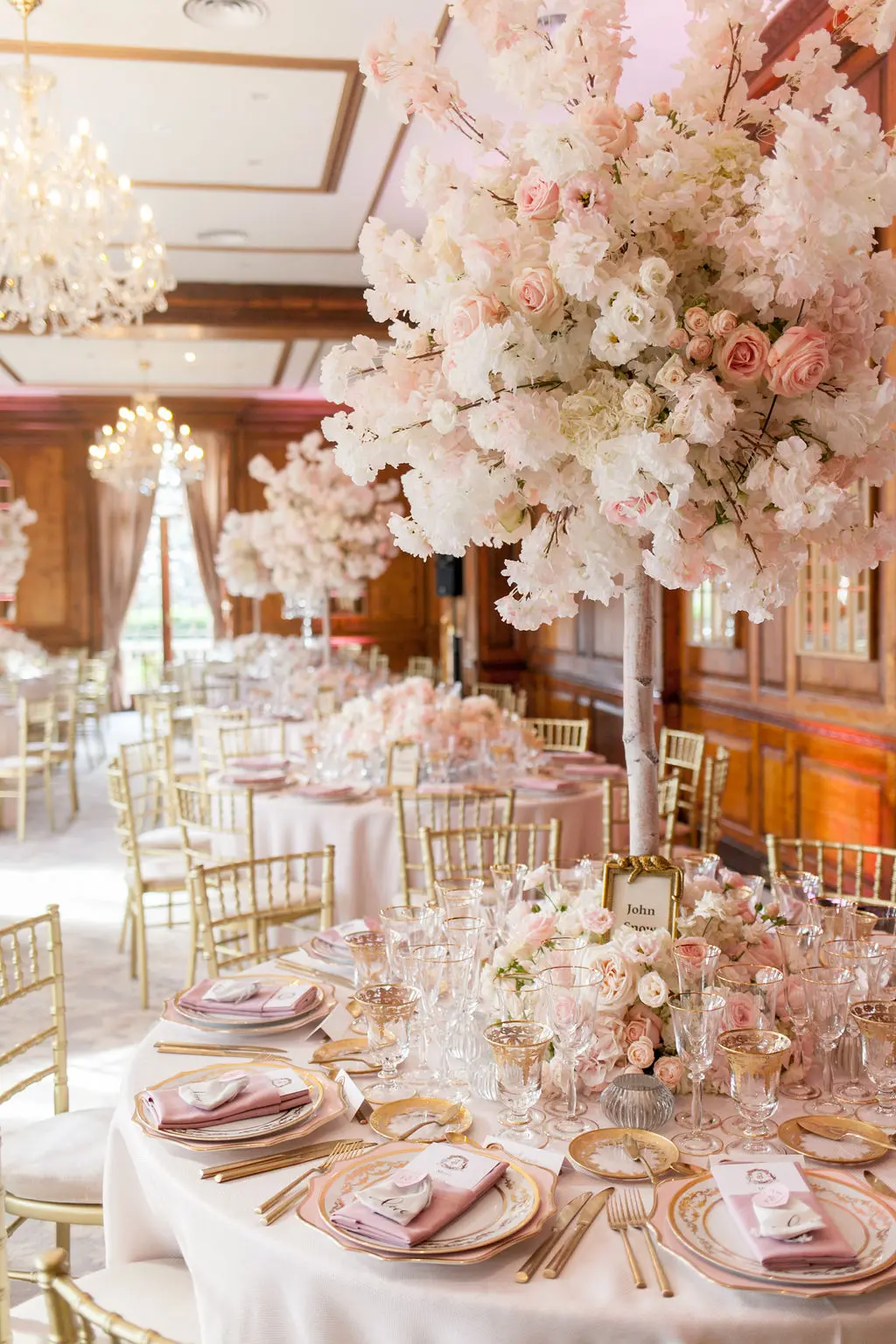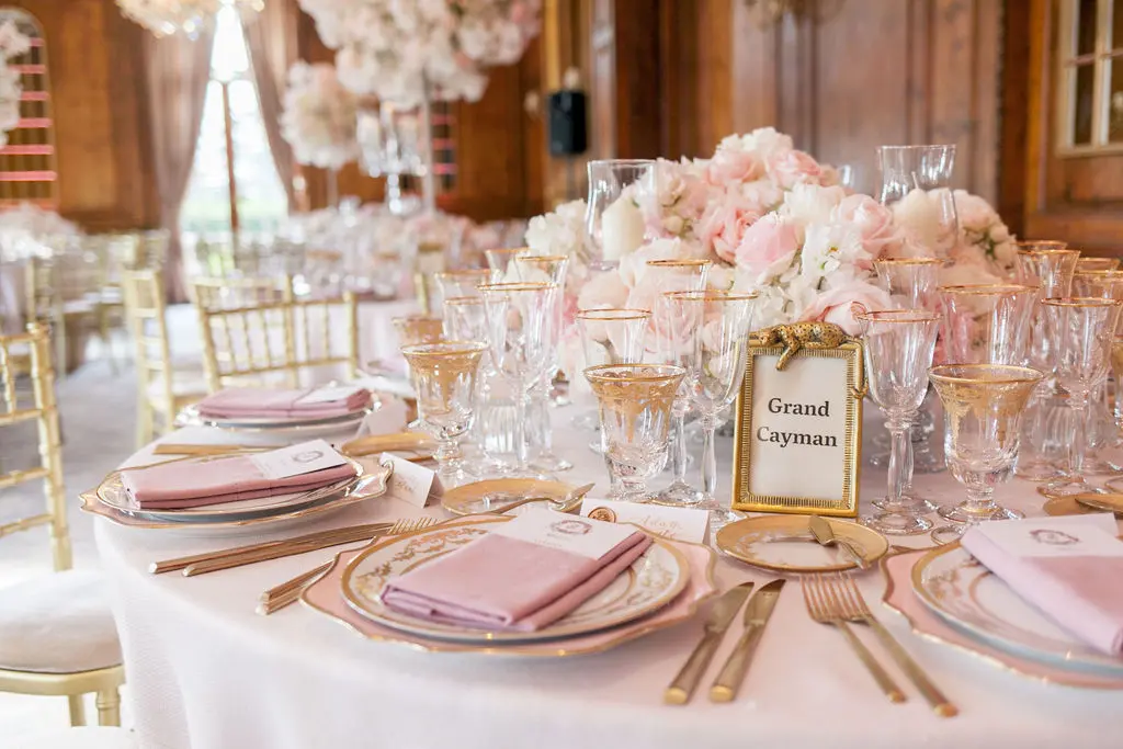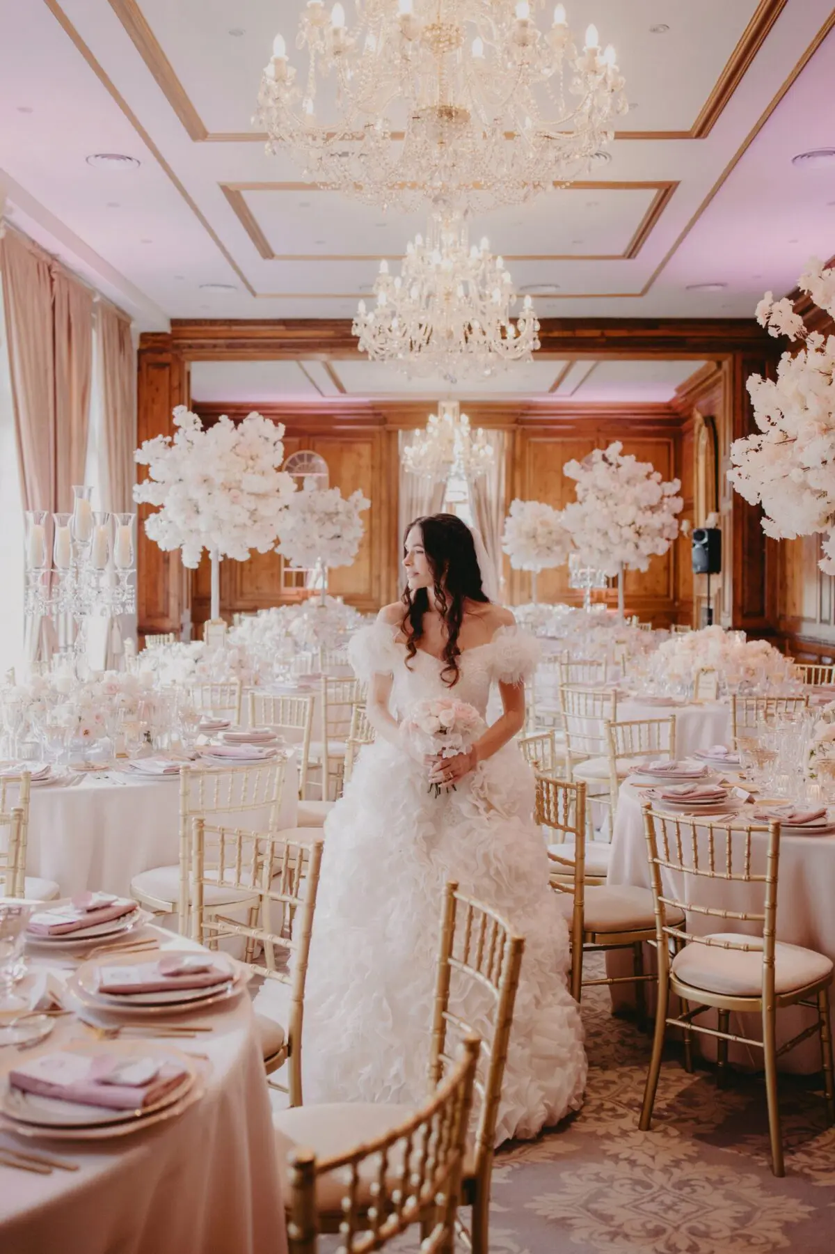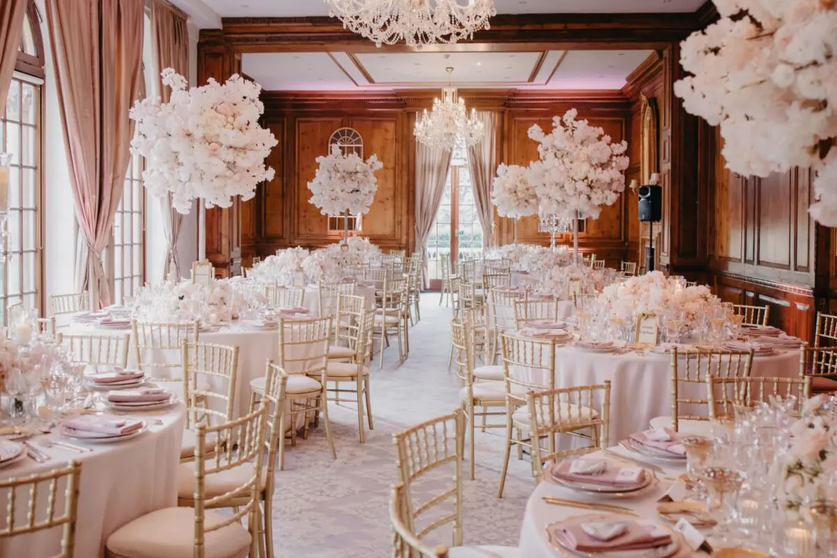 Dinner took place in the elegant Ballroom, which was transformed into a dreamy, blush and blossom-filled space. The colour scheme of pink, blush, white, and touches of gold created a Marie Antoinette-inspired ambiance, capturing the essence of romance and elegance.