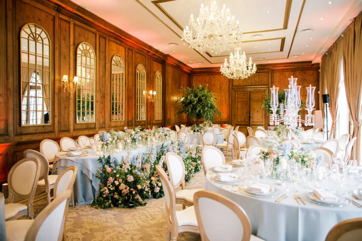 For the grand dinner, we moved into the ballroom, where the elegant surroundings lent an air of sophistication to the evening. The tables were adorned with English garden flowers, and the design beautifully incorporated the natural world, with hints of blue to accentuate the vibrant blooms. It was a true feast for the senses, a celebration of both love and the beauty of nature.